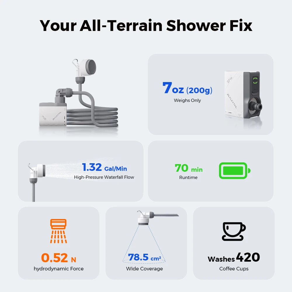 The FLEXTAIL portable shower pump provides a convenient and powerful solution for outdoor showers during camping, hiking, or travel. Featuring an IPX7 waterproof pump head and flexible hose, it ensures safe and reliable water flow. Rechargeable and lightweight, the pump is easy to carry and set up, delivering consistent water pressure wherever needed. Perfect for campers, backpackers, or outdoor enthusiasts, this pump allows for comfortable, portable showers in any environment.