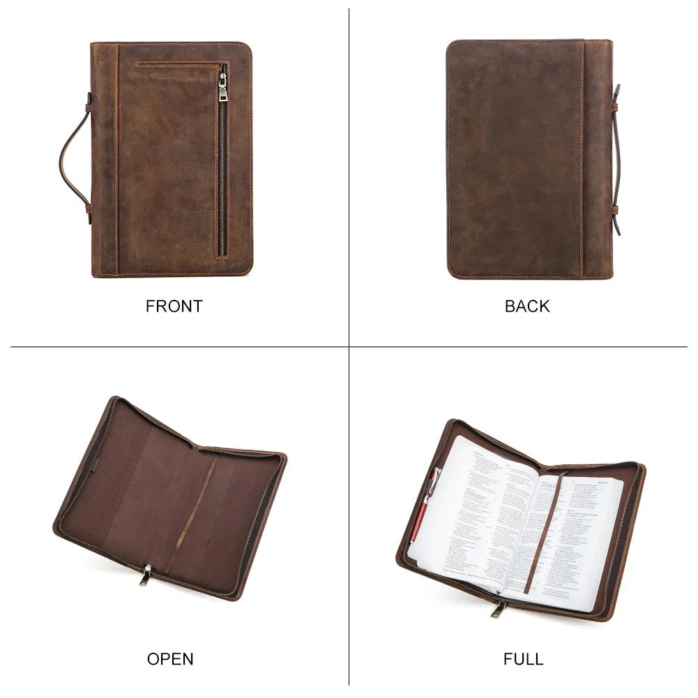 This handmade cowhide leather book cover combines elegance, functionality, and durability, making it perfect for notebooks, Bibles, or travel journals. Featuring a pen holder, phone pocket, and wrist strap, it keeps your essentials organized and easily accessible on the go. Designed as a stylish clutch, it doubles as a practical travel portfolio, protecting your documents and devices while maintaining a sophisticated look. Ideal for students, professionals, or anyone seeking a premium leather accessory for everyday use or travel.
